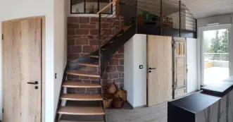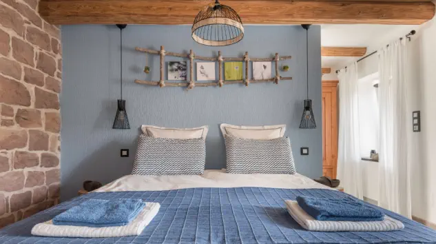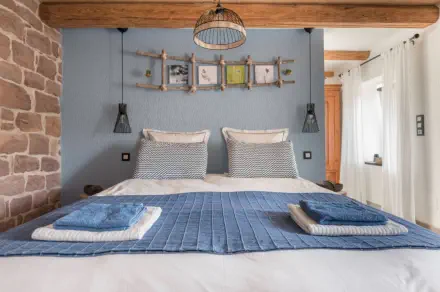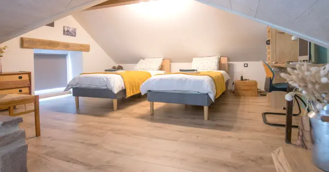 Les deux chambres bénéficient d’une fraîcheur naturelle grâce aux murs épais en grès des Vosges.
