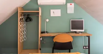 L’espace nuit en mezzanine est climatisé et équipé d’un bureau avec un accès internet pour le télétravail.