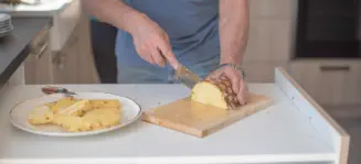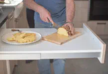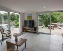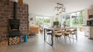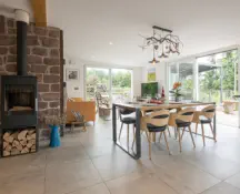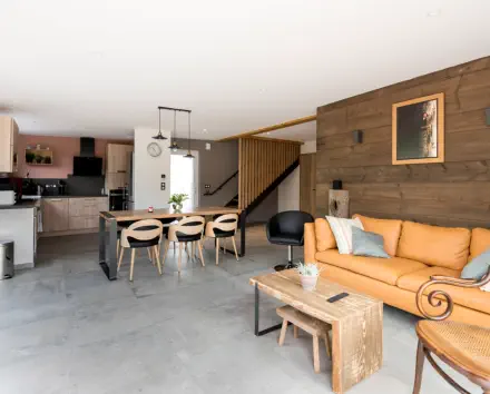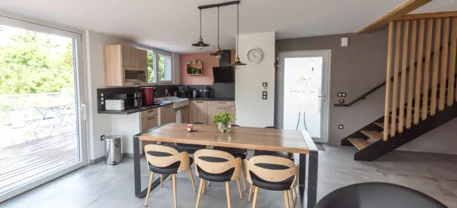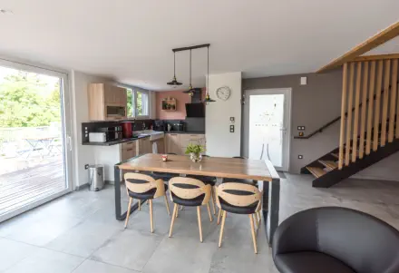 Le niveau en rez-de-jardin comprend un vaste séjour avec cuisine ouverte entièrement équipée, une table de séjour avec 6 chaises