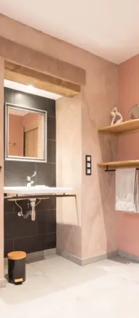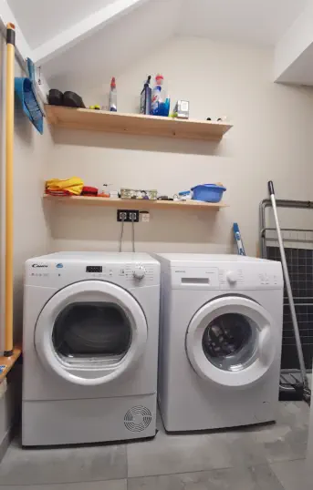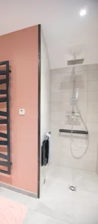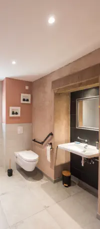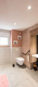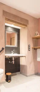 Au même niveau, se trouvent une salle de bain avec WC accessibles aux personnes à mobilité réduite ainsi qu’un local technique
