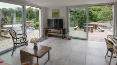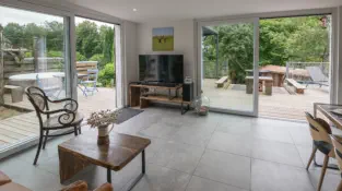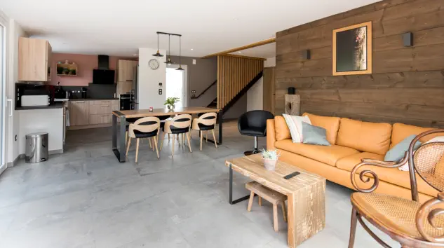 Le niveau en rez-de-jardin comprend un vaste séjour avec cuisine ouverte entièrement équipée, une table de séjour avec 6 chaises